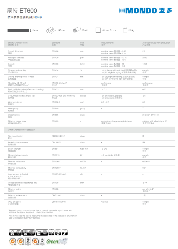 盟多康特(ET600)系列地板產(chǎn)品是一款全新同質(zhì)透心無方向PVC地板,地板表面為同色系粒花型,T級耐磨,可選顏色為32種,適用于各種室內(nèi)環(huán)境。盟多康特(ET600)系列地板產(chǎn)品是經(jīng)壓延工藝處理,由一款單層同質(zhì)透心層構(gòu)成的地板產(chǎn)品。TD-Plus特殊維護(hù)處理可從地板安裝之日起保護(hù)地板表面,易于清潔與除塵。這種工藝可大大減少人工及機(jī)械維護(hù)成本,以及清潔維護(hù)成本。連接處可采用熱焊處理:可選用與地板底色相同色調(diào)的焊線或選用反差較大的顏色的焊線焊接。地板應(yīng)使用地板專用膠粘于適合基層上。盟多康特(ET600)系列地板產(chǎn)品符合EN649標(biāo)準(zhǔn)。