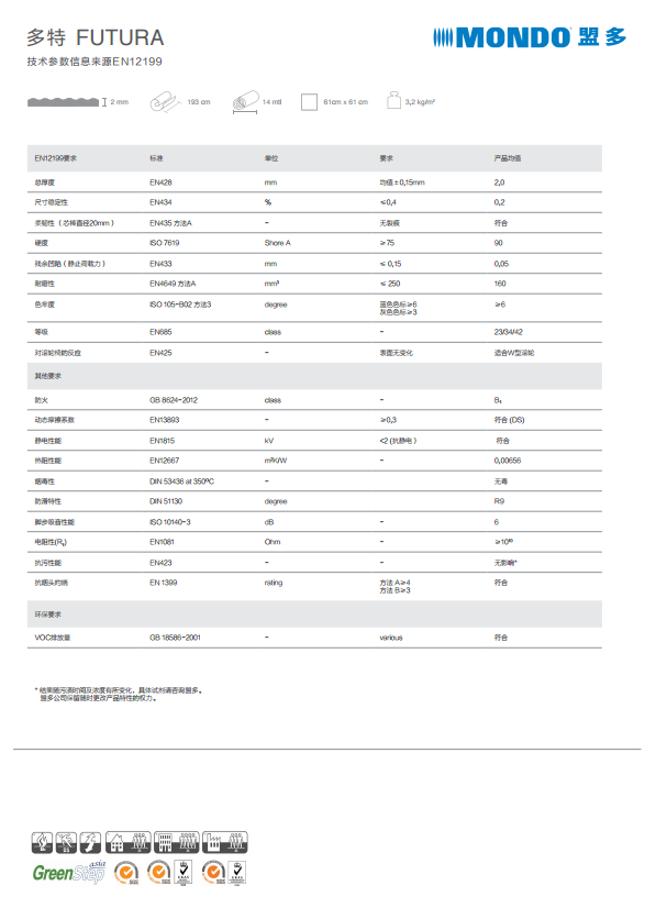 盟多多特(FUTURA )系列橡膠地板的表面經(jīng)特*處理達(dá)到一種錘擊紋效果,由多顏色的顆粒狀圖案平均分布在單一顏色的地板底色上。非平滑表面,亞光。盟多多特(FUTURA )系列橡膠地板經(jīng)壓延,硫化,穩(wěn)定加工處理。過程中,橡膠地板的工藝特性使其更易清潔與除塵。連接處可使用焊線對(duì)地板進(jìn)行焊接。地板應(yīng)使用橡膠地板專用膠粘于適合基層上。盟多多特(FUTURA )系列符合EN 12199標(biāo)準(zhǔn)。
