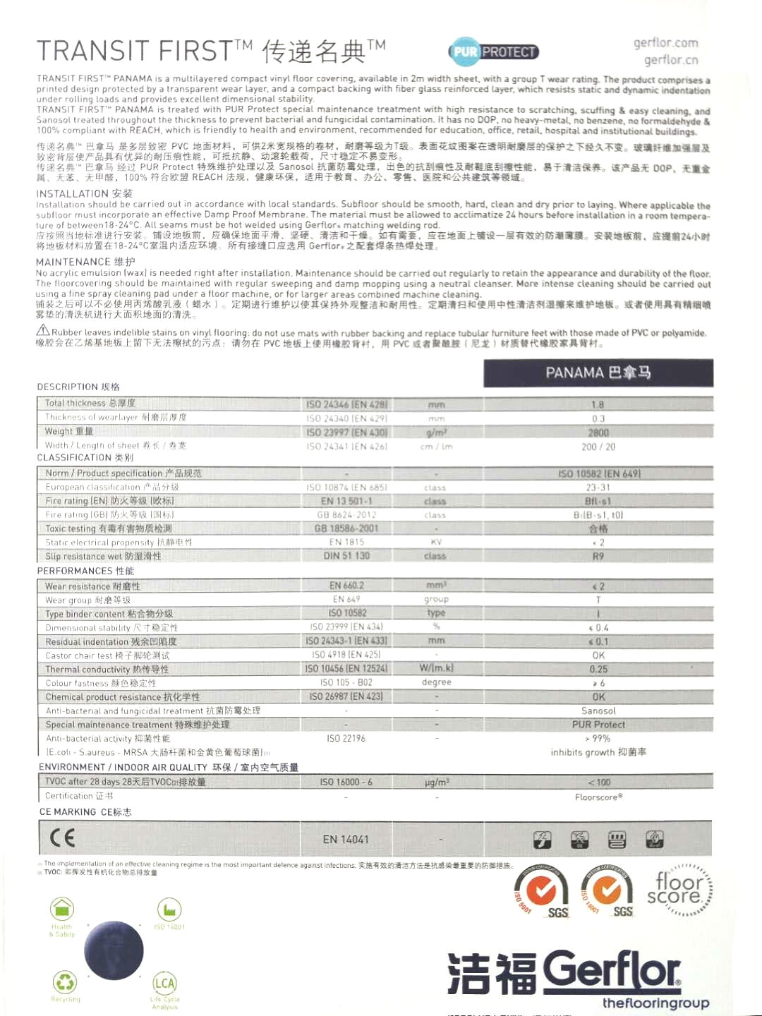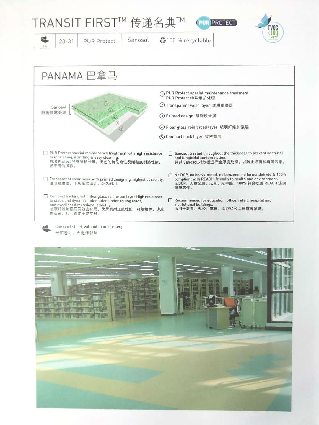 層使用 具有優(yōu)異的耐壓痕性能,可抵抗靜、動(dòng)滾輪載荷,尺寸穩(wěn)定不變形。 潔福傳遞名典巴拿馬經(jīng)過PUR Protect特殊維護(hù)處理及Sanosol抗菌防霉處理,出色 的抗刮痕性及耐鞋底刮擦性能,易于清潔保養(yǎng)。該產(chǎn)品無DOP,無重金屬、無苯、無甲 醛 健康環(huán)保、適用于:教育、辦公、零售、醫(yī)院和公共建筑等領(lǐng)域。