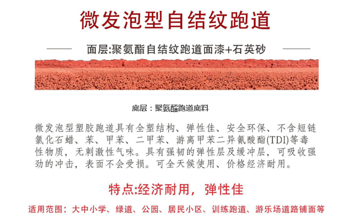 該產(chǎn)品具有傳統(tǒng)型跑道的特點(diǎn),同時(shí)具有優(yōu)良的防滑性能和良好的耐用性,能提供運(yùn)動(dòng)力學(xué)特征的組合。充分發(fā)揮運(yùn)動(dòng)員的競(jìng)技水平。