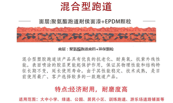混合型塑膠跑道主要應(yīng)用為室外田徑跑道及田徑運(yùn)動(dòng)場(chǎng)地內(nèi)半圓區(qū)。適合于各級(jí)比賽、**教學(xué)、訓(xùn)練等跑道場(chǎng)地。要求攤鋪在瀝青基礎(chǔ)之上,鋪設(shè)粘結(jié)牢固、壽命長(zhǎng)。較為通用。